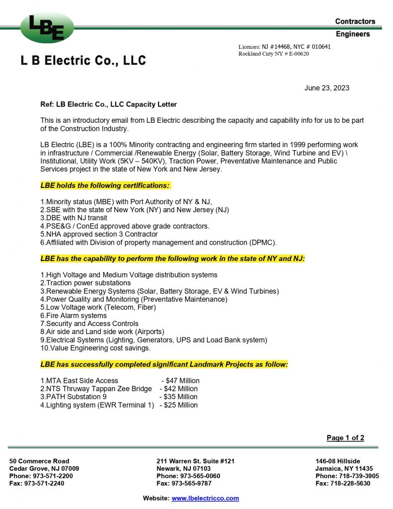 In 1999, Leon decided it was time to launch LB Electric Company, LLC (LBE) , at EDC III, Newark, NJ. LB Electric provides electrical systems, testing, solar (photovoltaic), designs and installation for major organizations, including, but not limited to: commercial, industrial, schools, hospitals and government agencies.